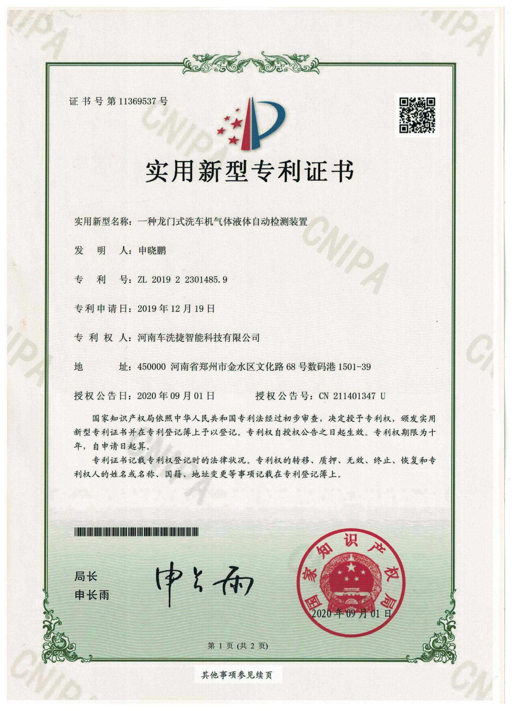 专利-一种龙门式洗车机气体液体自动检测装置